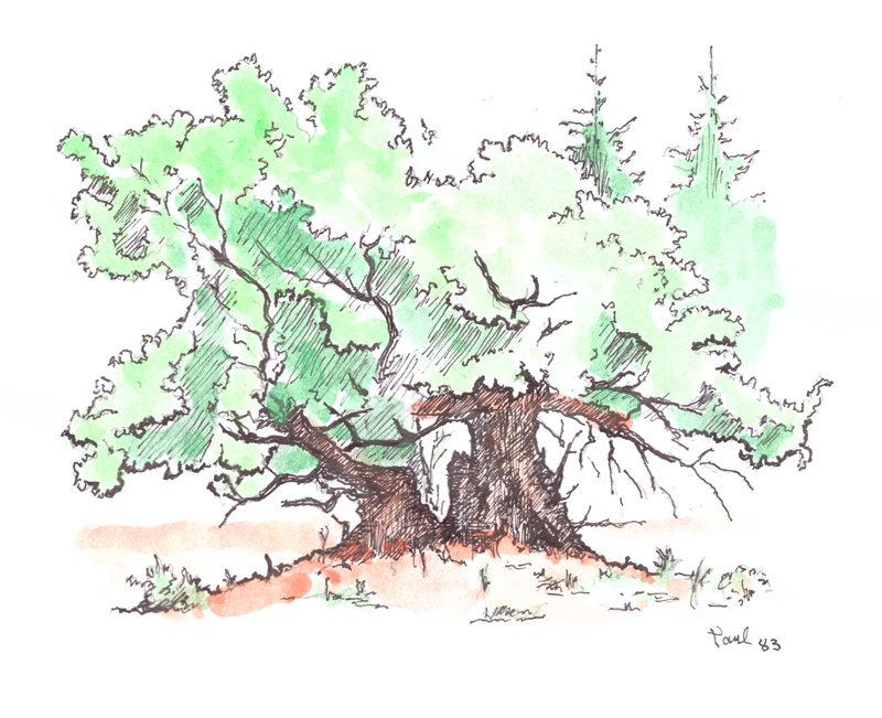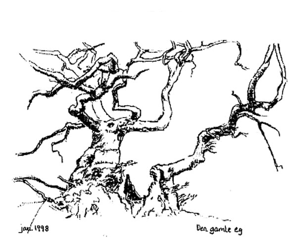 Da jeg kom hertil i 1964, var der stadig liv i egen. Men for hvert år blev det mindre og mindre, og da foråret kom i 2010, var der ikke et eneste blad. Og nu står den og taber den ene stamme efter den anden, som årene går.